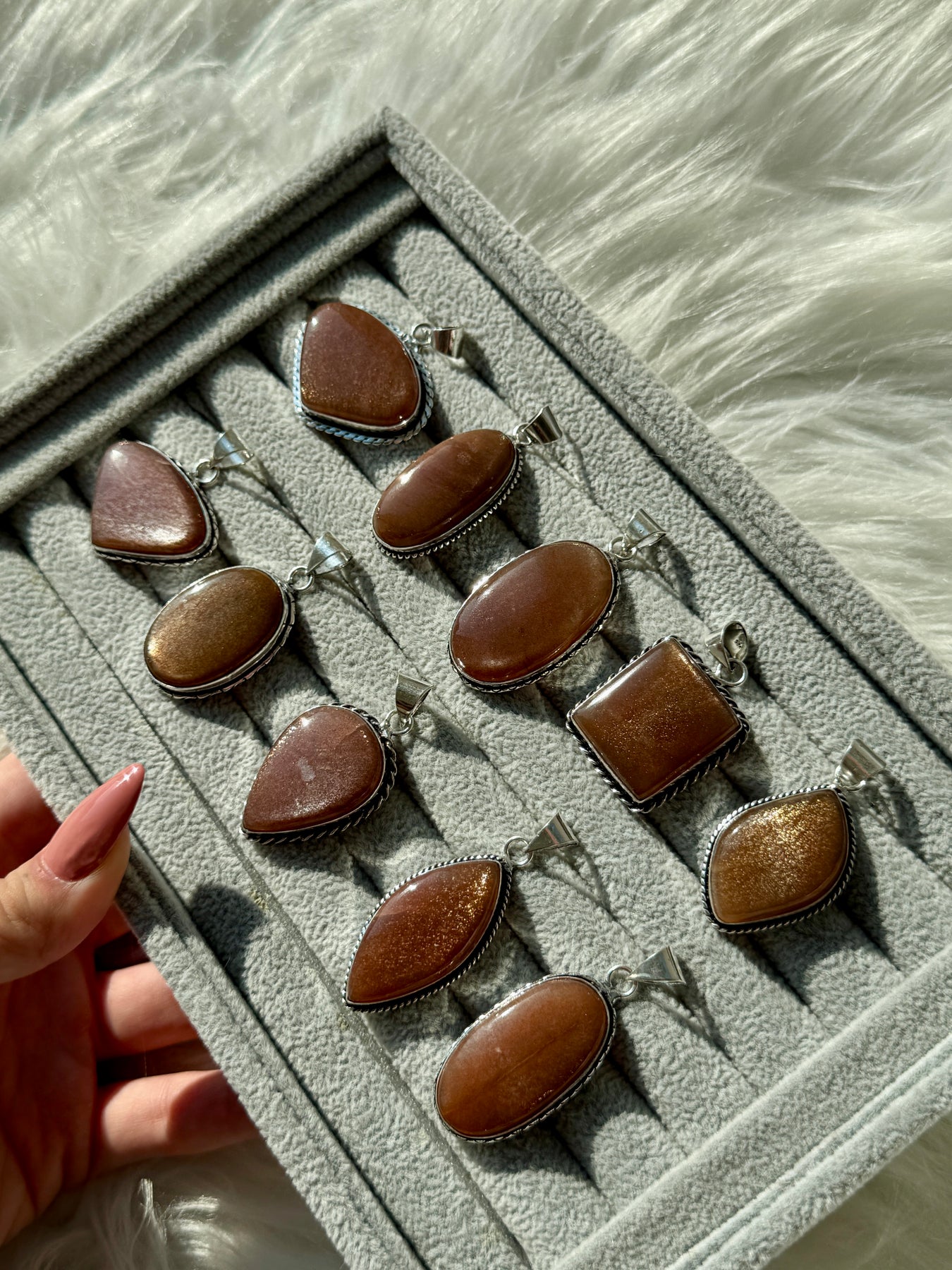 La pietra del sole, con i suoi riflessi caldi e scintillanti, è un feldspato ricco di inclusioni di ematite o goethite, che le conferiscono il suo tipico effetto “glitter”.